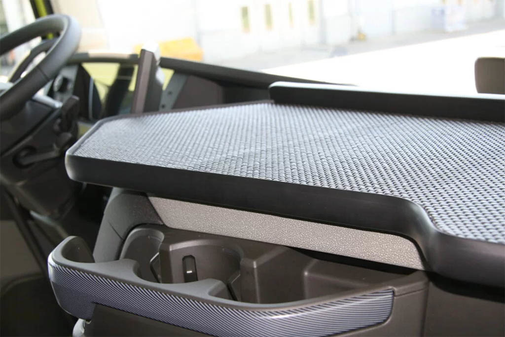 This Dashboard table full length - Volvo FH5 (from 2021) is a stylish MAXI table. It offers an extra large surface for storing things. The legs of the table accurately trace the contours of the panel surface, making the table extremely stable, and the 7mm high edge above the table and the non-slip mat keep your computer or phone safe throughout the journey.