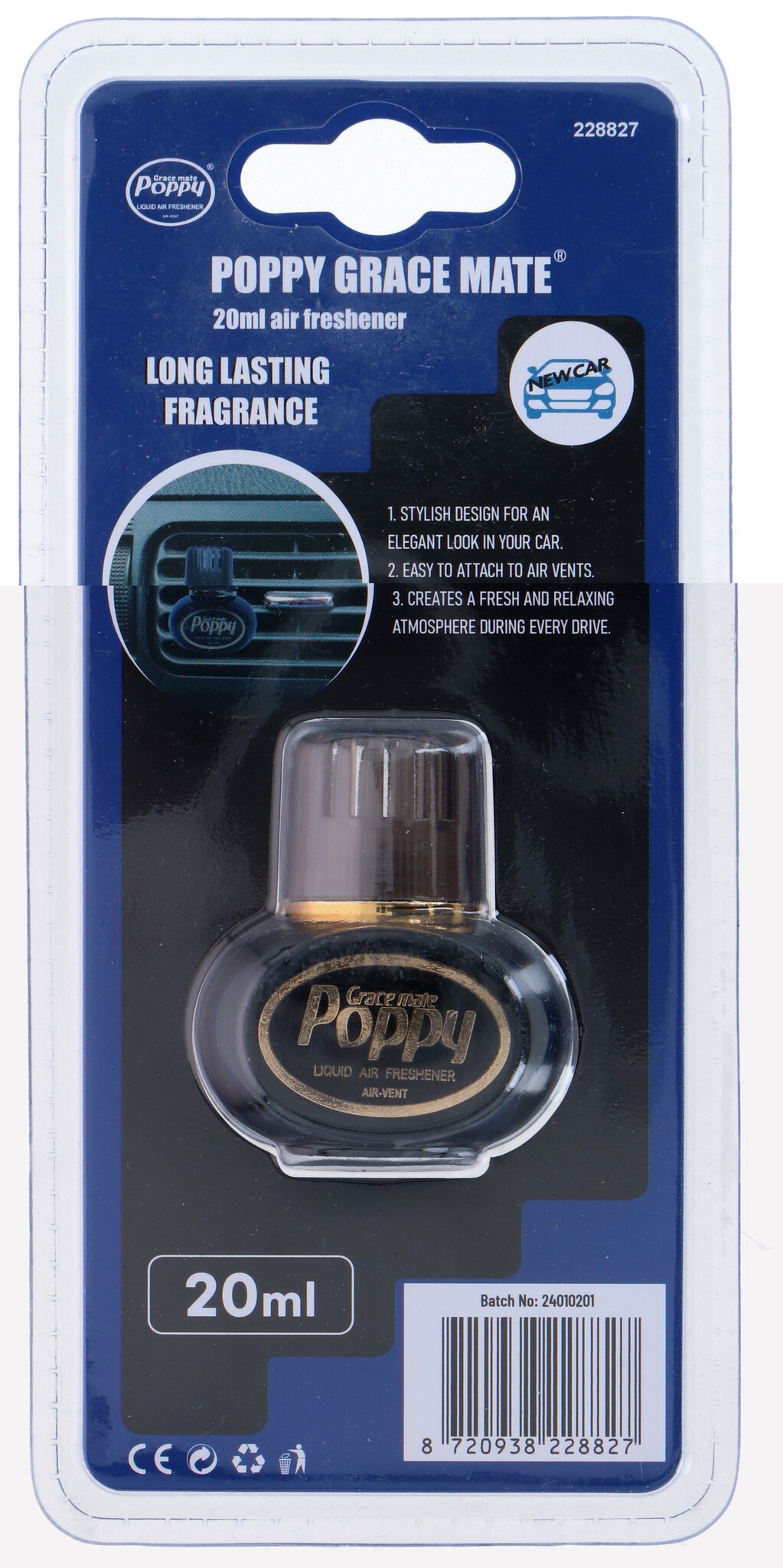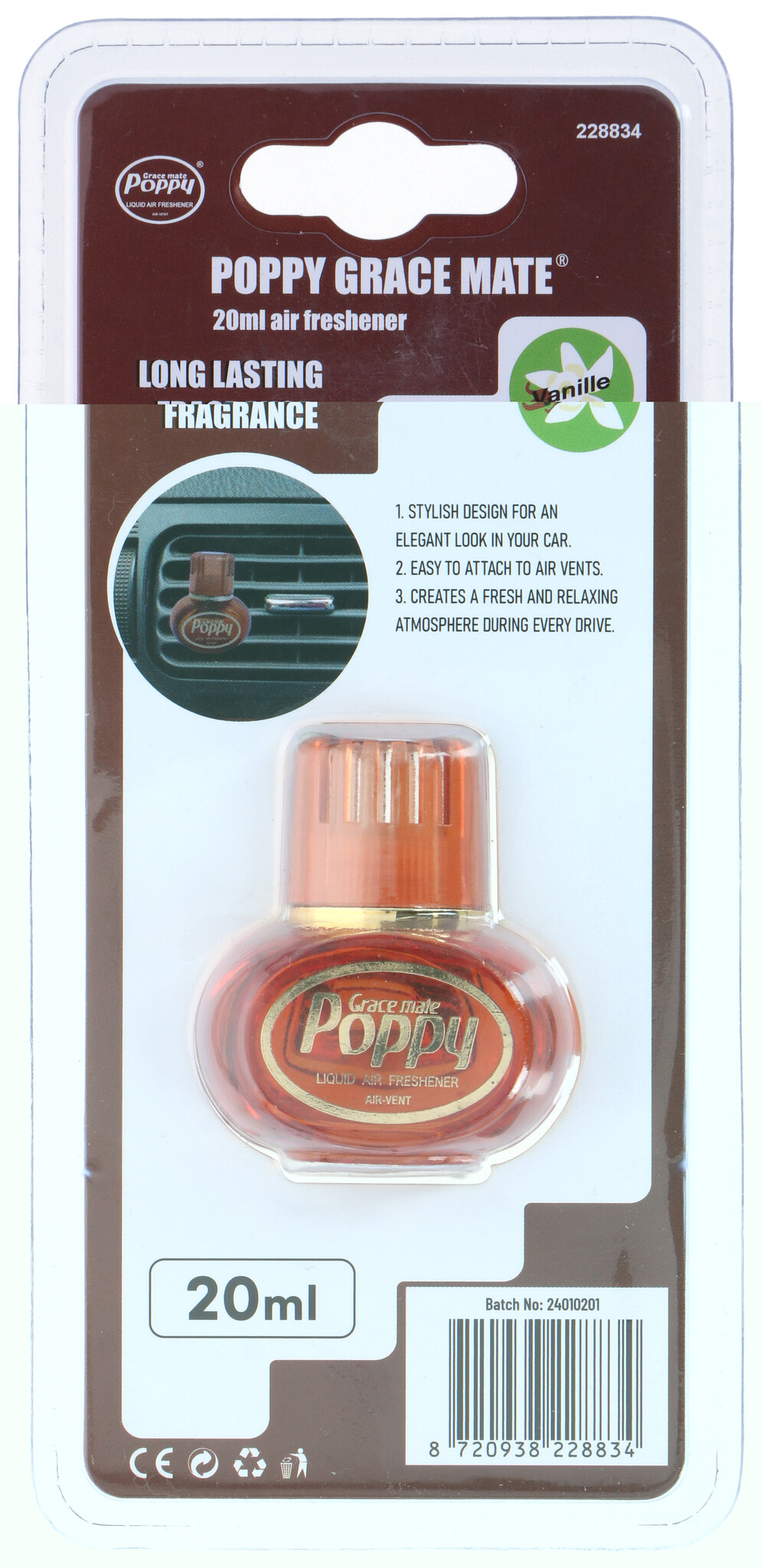 The Poppy Grace mate - mini is here again! This small glass scent bottle with a capacity of 20ml is ideal to hang on your fan grill of your car or truck. The Poppy Grace mate - mini is available in the well-known Poppy Grace mate fragrances: Cherry, Jasmine, New Car, Vanilla, Pine and Freesia. The Poppy Grace Mate - mini is ideal for anyone who likes a subtle air freshener in his/her car or truck.