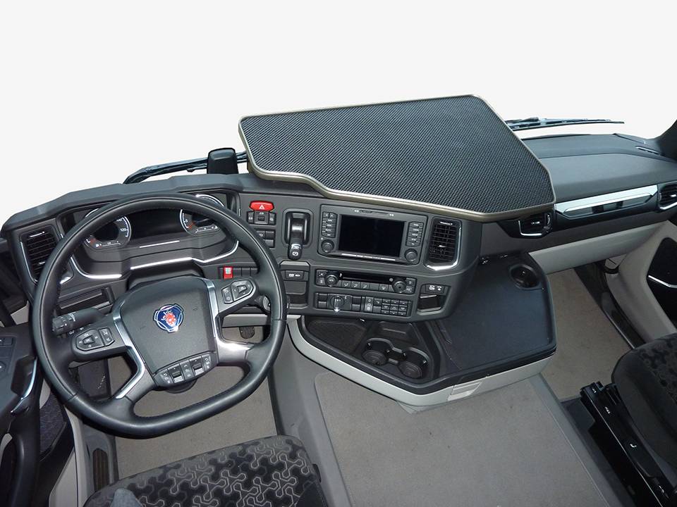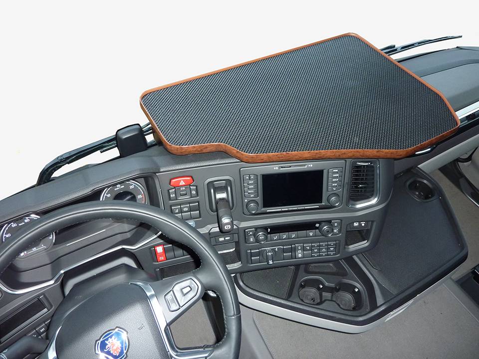 The luxury center console for Scania R & S (from 08.2016). Available with finish in bronze, wood or black (see extra photo). Accessories: anti-slip mat is included. Mounting: the tables are very easy to install, complete installation material is included.