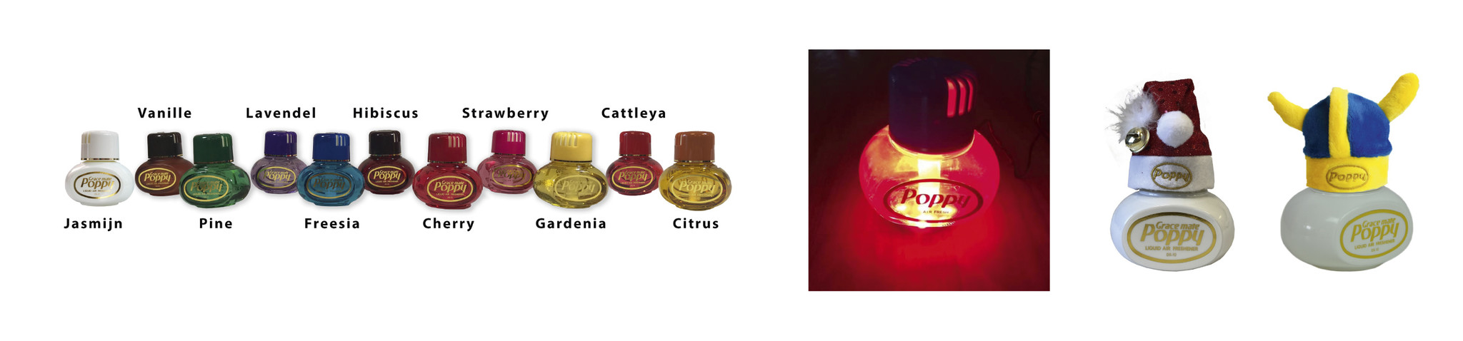 Poppy Grace Mate van Diax; de populairste luchtverfrisser onder de truckers. Verkrijgbaar in 11 verschillende geuren (en kleuren!). De best verkochte is de witte versie (jasmijn), maar wij denken dat dit vooral is omdat die zo mooi staat op de Poppy ledverlichting. Klein Poppy kerstmutsje of vikinghoedje er boven op, zodat de luchtverfrisser het zeker niet koud krijgt. ;-)