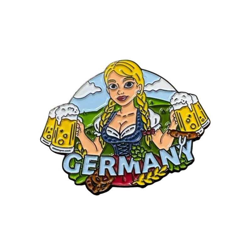 De Germany Pin brengt de sfeer van Duitsland tot leven met een vrolijke knipoog naar traditionele biercultuur en Oktoberfest-stijl. Met de blonde serveerster in klassieke dirndl, twee schuimende bierpullen en een achtergrond vol frisse groene weiden straalt deze pin pure Duitse gezelligheid uit. Een opvallend en luchtig design dat perfect past op de zonneklep, gordijnrand, pet of in iedere verzameling van chauffeurs die vaak over de Duitse Autobahn gaan.