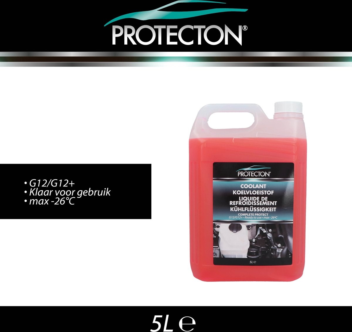 De Protecton Complete Bescherming Koelvloeistof 5L zorgt voor een optimale koeling van de motor in zomer en winter, zodat deze op de juiste tempratuur blijft en niet oververhit raakt. De kant en klare Protecton Complete Bescherming Koelvloeistof 5L kan zonder verdunning direct gebruikt worden en geeft bescherming tot -26° C. Is mengbaar met alle soorten en kleuren koelvloeistof en geschikt voor alle merken, alle modellen en alle bouwjaren. Geen water of antivries toevoegen!