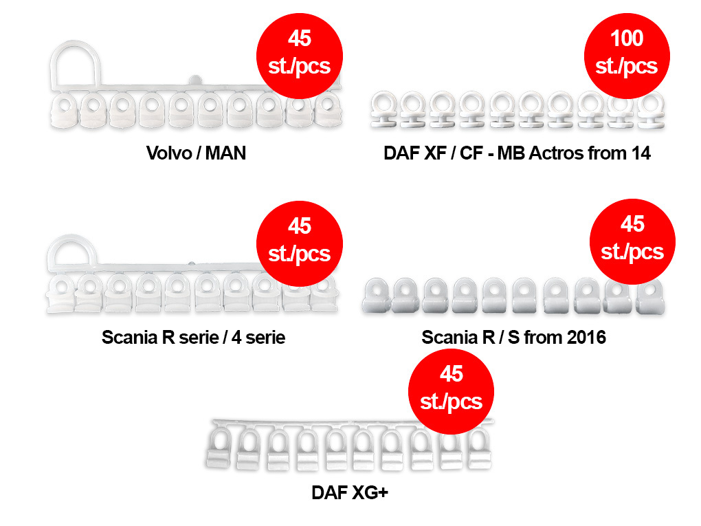 Gordijnrunners/glijders voor gebruik in de vrachtwagen. Worden geleverd in sets van 45 stuks. Bekijk de extra foto's voor meer informatie.